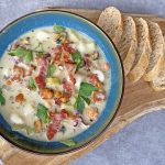 Clam Chowder is een dikke soep met vis, schelpdieren en groenten. In de VS zijn er verschillende versies van Clam Chowder. In deze versie uit New England worden schaaldieren en zeevruchten gebruikt in combinatie met een romige soep. Eigenlijk is het een soort surf en turf gerecht; een gerecht met vis én vlees. In deze clam chowder wordt namelijk ook uitgebakken spek gebruikt.