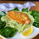 Leg een deel spinazieblad aan de rand van een bord. Schep een opscheplepel puree in het midden. Leg een kipfilet op de puree en leg er een schijfje citroen op.