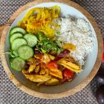 Schep de rijst en de pruimencurry in een kom. Garneer met komkommer en atjar tjampoer.