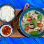 Serveer de groene curry in een grote kom of bowl met de rijst en saus ernaast in andere kommetjes.