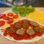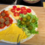 Smeer 1 kwart van de tortilla in met de tacosaus. Snij 3 vegaballetjes in plakjes druk deze in de saus.